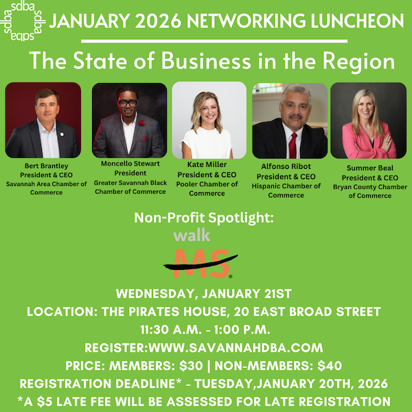 The Savannah Downtown Business Association invites members and guests to attend its January 2026 Networking Luncheon on Wednesday, January 21, 2026, from 11:30 a.m. to 1:00 p.m. at The Pirates House in downtown Savannah. The luncheon will feature an engaging and informative conversation on The State of Business in the Region. This highly anticipated event will bring together business and community leaders for a timely discussion on the economic trends, workforce development challenges, and emerging opportunities shaping the future of our region.