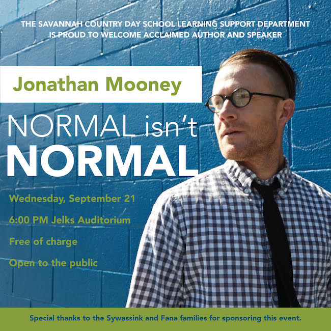The Savannah Country Day School Learning Support Department is pleased to host renowned speaker and learning differences advocate Jonathan Mooney on Wednesday, September 21 at 6:00PM in Jelks Auditorium. Jonathan Mooney has carried - he might well say battled - diagnoses of ADHD and dyslexia through multiple schools and multiple frustrations to an honors degree in English from Brown University, the publication of three very successful books, the creation of award-winning entrepreneurial and philanthropic foundations, and a position as a much-sought-after speaker at multiple conferences and schools, recently including the 2021 SAIS Academic Support Conference, Miami Country Day School, and Milton Academy. Along this journey, Jonathan came to realize just how narrow and artificial a definition of "normal" can be, especially after he toured the country finding an incredible range of diverse and gifted individuals.