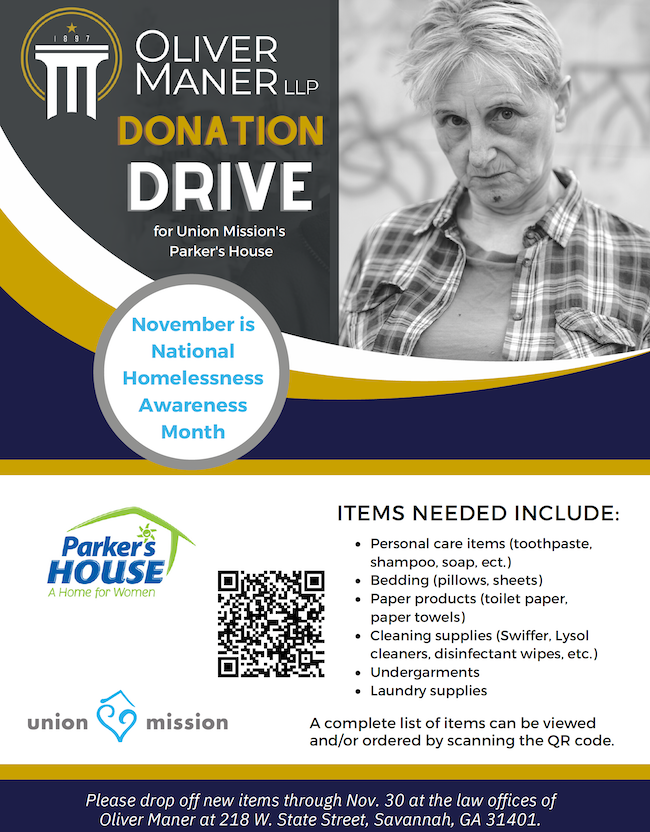 In recognition of National Homeless Awareness month in November, Oliver Maner, one of Savannah’s most prestigious law firms, will once again partner with other local law firms to raise funds and collect supplies for Parker’s House at Union Mission. This new program is Savannah and Coastal Georgia’s only facility solely dedicated to providing emergency housing and comprehensive supportive services for unaccompanied women experiencing homelessness.